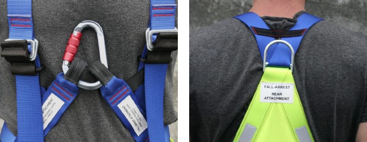 The height safety harness is provided with both front and rear attachment points, which are both labelled and rated for fall-arrest. At the rear is a D-ring, and at the front are two webbing loops. These loops must be connected together. When connecting to the rear attachment point, wherever possible connect the lanyard before putting the harness on, or have a second person check the integrity of the connection. The lanyard (or other means of connecting to an anchorage) should be connected to the anchorage above the level of the attachment D-ring and the amount of slack in the system minimised, so that any fall that may happen is as short as possible.