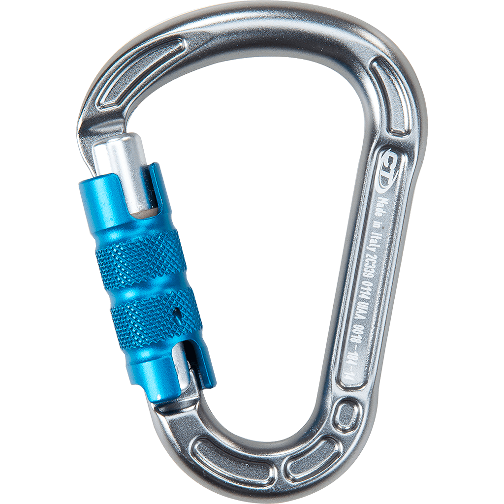 Hot-forged light alloy HMS carabiner with triplex twist-lock gate, conceived for use in trad and sport climb and mountaineering in general.