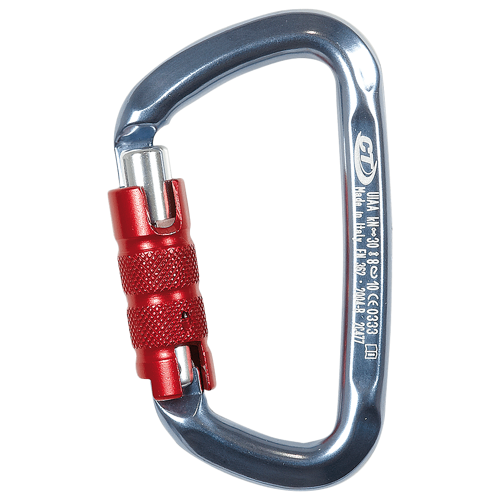 D-shape light alloy carabiner with triple twist-lock gate, conceived for use in mountaineering, hauling and rescue operations.
