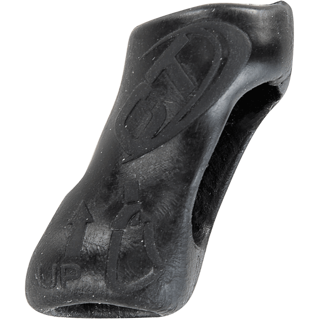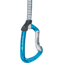 New innovative shaped rubber fastener for quickdraw slings (patent pending). It secures the lower carabiner of the quickdraw to the sling, preventing the accidental rotation and keeps it on the axis. It also protects the sling from wear and tear.