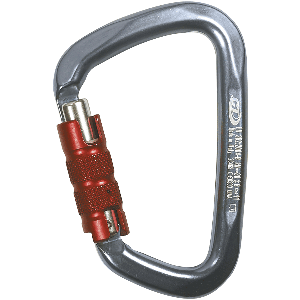 Multipurpose light alloy carabiner, large base and wide sizes, with triplex twist-lock gate, conceived for rescue situations and for alpinism in general.
