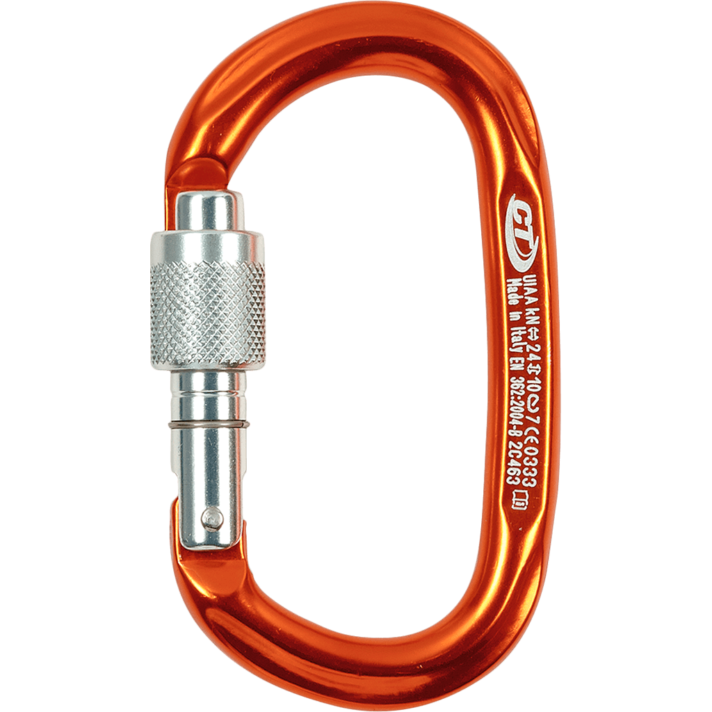 Light alloy oval-shaped carabiner with screwgate, designed for mountaineering, aid climb, big wall, speleology, and rescue operations.