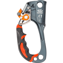 Left hand light alloy ascender handle with ergonomic rubber grip for climbing ropes.