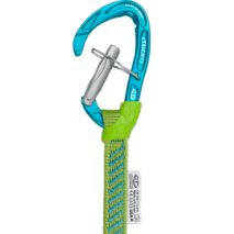 The Tricky is a useful device that allows the carabiner to be easily clipped into a far piece of protection, otherwise out of reach. Thanks to a long sling and to the tricky lever system, fully integrated in the body of the carabiner, the device makes it possible to clip into far placements. The lever of the carabiner is kept open and is automatically released when the system is pulled downward. The loop featuring at the bottom of the sling allows for easy grabbing of the system while A0-ing.