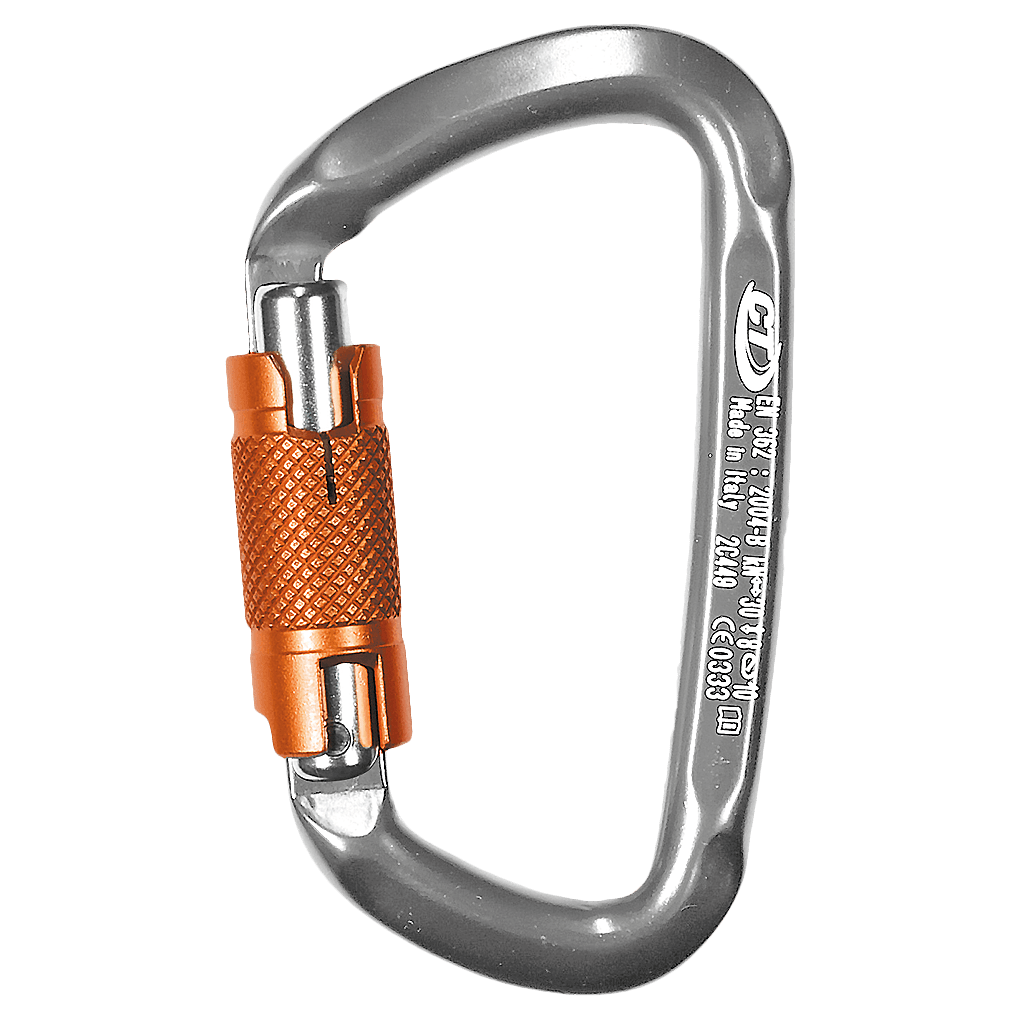 D-shape light alloy connector with twist-lock gate, ideal to be used as a terminal connection for lanyards or to set up a belay.