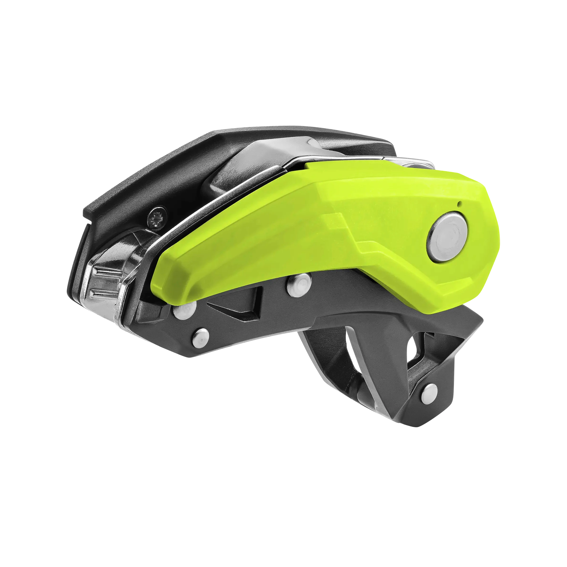 Pinch – a new belaying experience with the PINCH, a new, versatile assisted braking belay device for use in sport climbing, multi-pitch climbing and rope access techniques. The PINCH is the first device on the market that can be attached directly to the central ring of the climbing harness. Thanks to its low, close-to-the-body position, the PINCH does not need to be fixed in place when releasing the rope and the brake rope can always be gripped with all fingers. In addition, the compact belay system provides an increased span, which allows the belayer to pay out 20 – 30 cm more rope at once. The linear rope run through the frontal steel braking grooves reduces rope tangles when lowering and abseiling. In addition to the lowering lever, the speed can be controlled by the pressure of the braking hand, which contributes to increased braking rope control, especially when using thin, soft ropes. The anti-panic function provides added safety not only for beginners. A special feature is the integrated second braking tier, which enables controlled lowering by pulling the lowering lever further when securing particularly light persons or in systems with high rope friction. Users and experienced rope access technicians can permanently deactivate the anti-panic function using a screw supplied. Another plus: When used on multi-pitch lengths, the PINCH is the only device on the market that can be attached to the belay station in four different directions in 90° increments. This means that the lowering lever can always be brought into a position in which it can be operated freely.