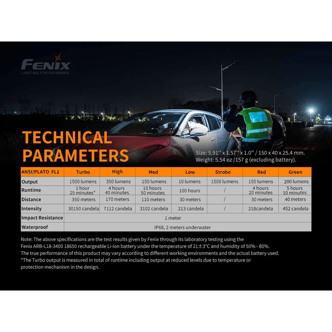 - Included: Fenix ARB-L18-3400 rechargeable li-ion battery, USB Type-C charging cable, lanyard, holster, spare O-ring, spare rubber switch boot