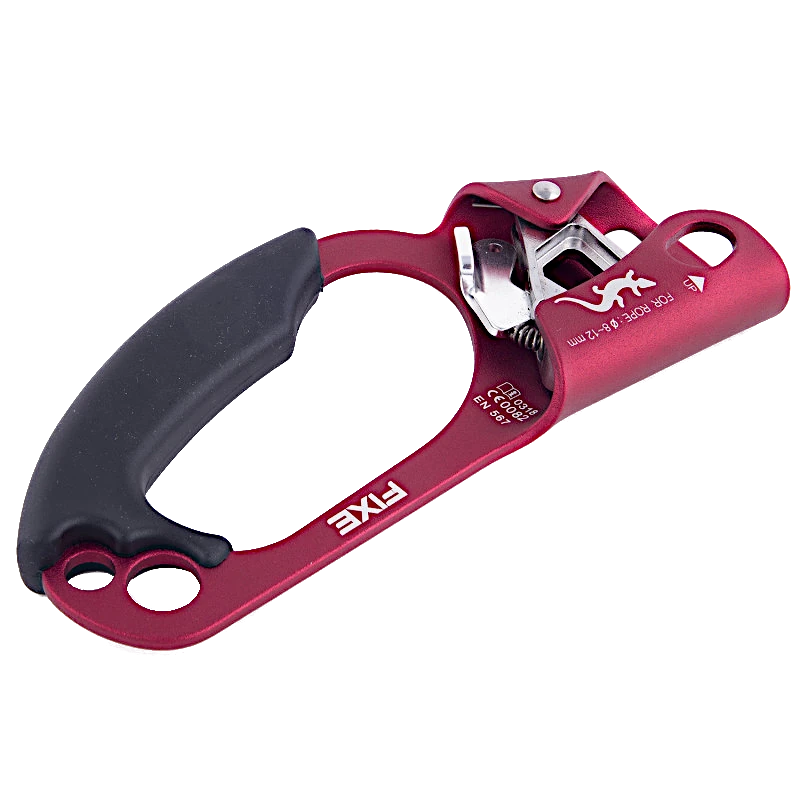 Left handled ascender for rope climbs featuring an ergonomic, non-slip handgrip for better grip and insulation. This ascender has two holes at the bottom to connect two carabiners for the foot loop and harness connection.