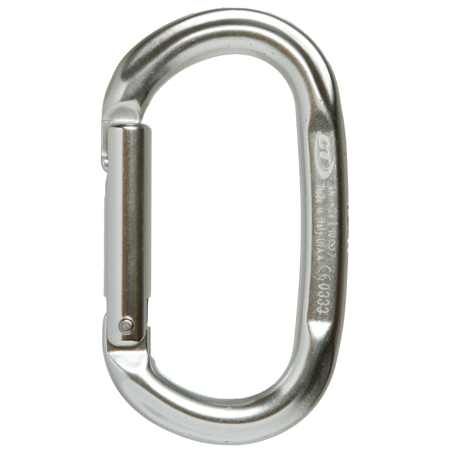 Hot-forged light alloy carabiner with an oval shape, straight gate and elevated workloads. Particularly suitable for recovery and rescue operations, mountaineering, speleology, aid climbing and big wall.