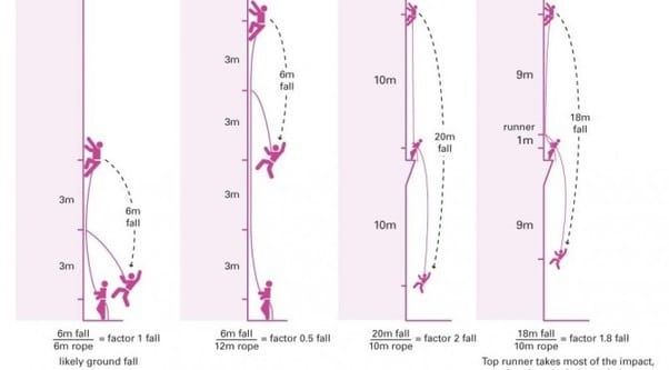 The fall factor is used to determine the severity of a fall while climbing. It ranges from 0 to 2, with Factor 2 being the most severe. The fall factor is the ratio between the height of the fall and the length of the rope. It will be Factor 2 when the height of the potential fall is twice the distance separating the climber from the anchor device.